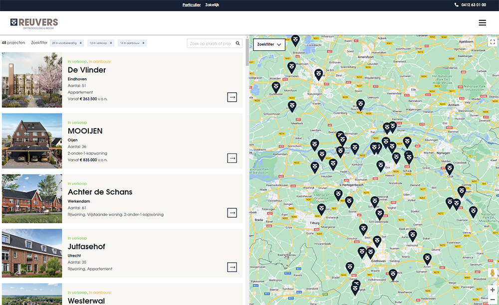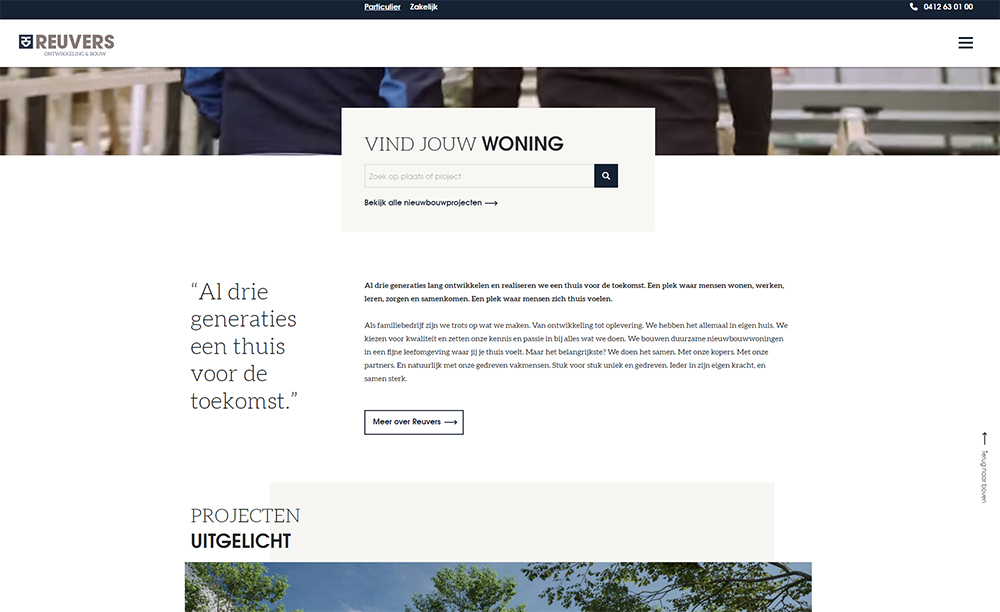 De corporate website van Reuvers Bouw en Ontwikkeling is onderdeel van de Webplus Cloud. Deze maakt gebruik van een aantal slimme tools, waaronder de interactieve situatietekening, prijslijsten en het publiceren van project- en woninginformatie op meerdere websites. Door één enkele handeling in de Webplus Cloud kan informatie van een bouwnummer worden aangepast, waardoor deze gewijzigd is in de situatietekening, maar ook in de prijslijst, het woningoverzicht én op de corporate website van Reuvers Bouw en Ontwikkeling. Dat is nog eens efficiënt!