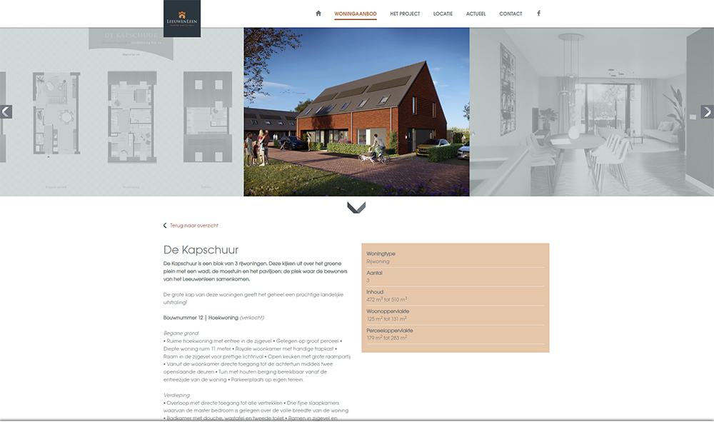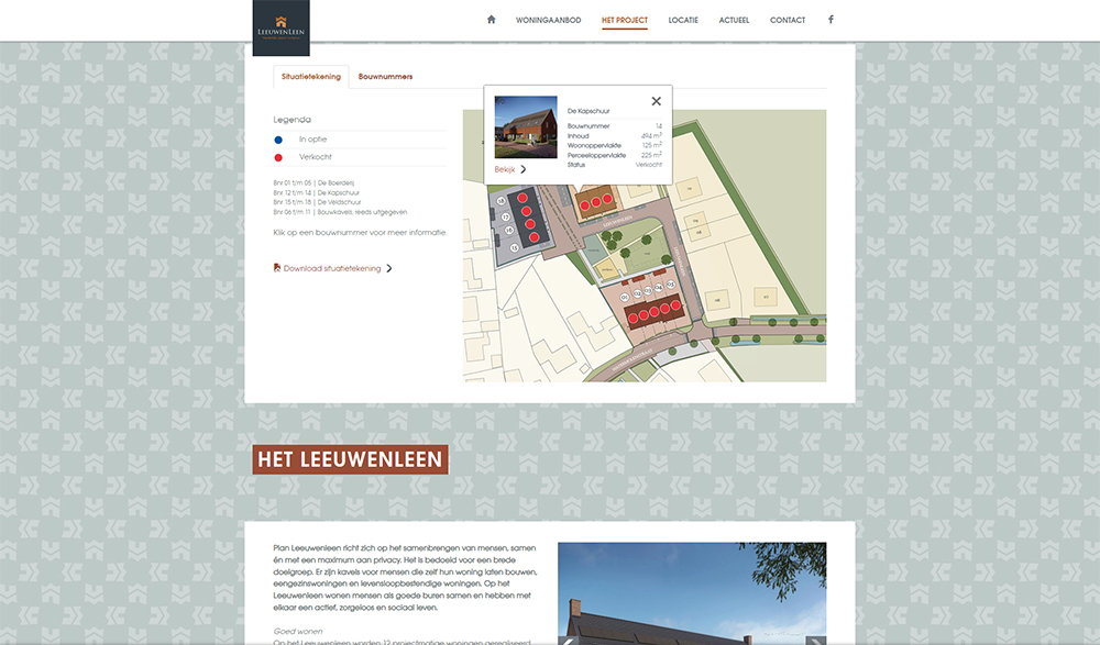 Wonen in Leeuwenleen is onderdeel van de Webplus Cloud oplossing die wij voor Reuvers Bouw en Ontwikkeling hebben gemaakt. Deze oplossing maakt gebruik van een aantal slimme tools, waaronder de interactieve situatietekening en prijslijst. Door één enkele handeling in de Webplus Cloud kan de informatie van een bouwnummer worden aangepast, waardoor deze gewijzigd is in de situatietekening op de projectwebsite, maar ook in de prijslijst, het woningoverzicht én op de corporate website van Reuvers Bouw en Ontwikkeling.